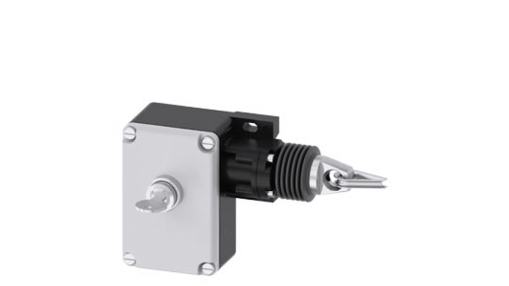 Interruttore a filo Siemens per monitoraggio e arresto di emergenza, configurazione 1NA/1NC, cavo da 50m, montaggio a vite, protezione IP54, serie 3SE7, contatti isolati elettricamente. Progettato per applicazioni in ambienti a rischio, richiede disattivazione del blocco per il ripristino.