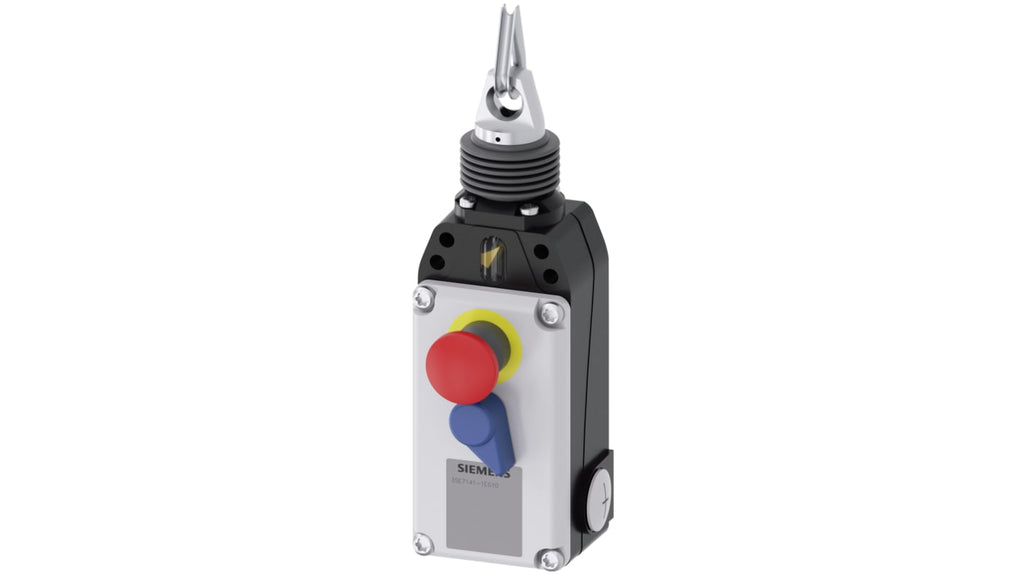 Interruttore a fune d'emergenza Siemens, cavo da 75m, montaggio Diritto, grado di protezione IP67, temperatura operativa da -25 a +70 gradi Celsius, tensione massima 250V, corrente massima 2A, contenitore in lega di alluminio, dimensioni 209 x 67 x 53mm, contatti 1 NA + 3 NC, conforme a EN ISO 13850, Categoria 4 secondo EN 954-1.
