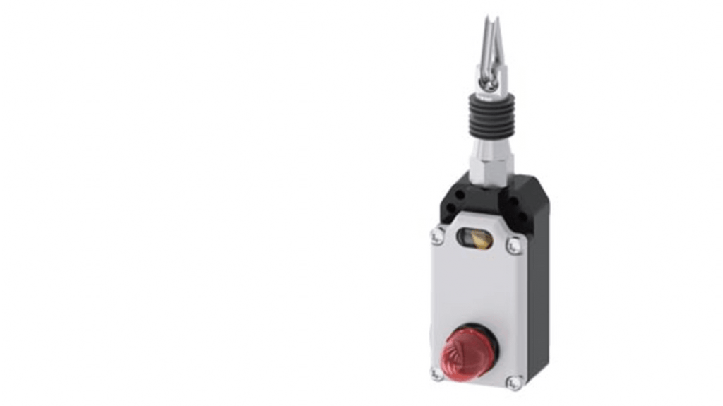 Interruttore a filo Siemens per monitoraggio e arresto di emergenza, configurazione 1NA/1NC, cavo da 20m, montaggio a vite, protezione IP65, serie 3SE7, contatti isolati elettricamente. Progettato per applicazioni in ambienti a rischio, richiede disattivazione del blocco per il ripristino.