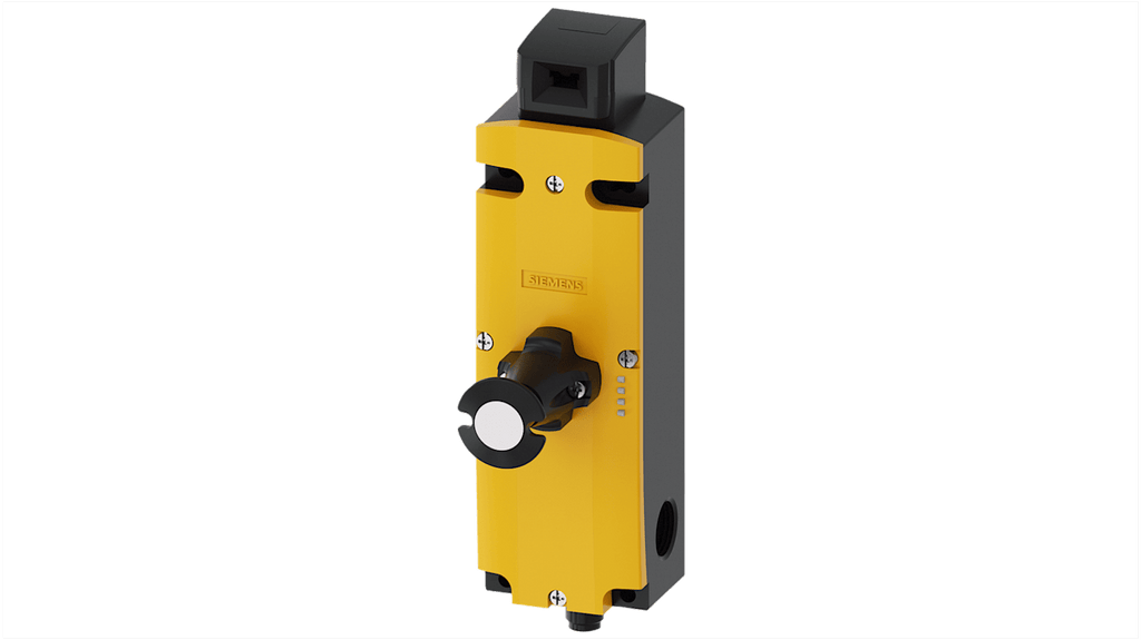 Interruttore di fine corsa Siemens, 2NC/1NA, codice 3SF1324-1SF21-1BA1. Forza di bloccaggio 1300 N, 5 direzioni di avvicinamento, custodia in plastica, tensione magnete 24 V c.c./c.a., classe di protezione IP66/IP67, montaggio a vite. Attuatori con codifica 3D, due LED per stato dispositivo, conforme a PL e SIL 3, disponibile con grado di protezione IP69K.