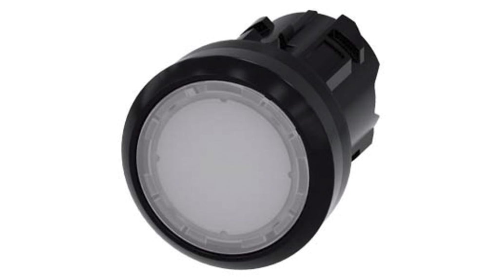 Pulsante Siemens, attuatore a pressione, diametro foro 22 mm, corpo bianco piatto rotondo, anello anteriore in plastica bianca, materiale plastico, protezione IP66, IP67, IP69K, temperatura di esercizio -25°C a 70°C, certificazioni CE, CSA, DIN EN 61373, IEC 60068-2-27, IEC 60068-2-6, IEC 60721, registrazione UL, dimensioni pulsante 29.5 mm, tipo di montaggio ad aggancio.