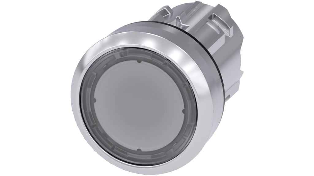 Attuatore pulsante tipo Instabile, diametro foro 22 mm, colore trasparente, materiale metallo lucido, protezione IP69K, progettato per ambienti estremi, funzione di automantenimento, protezione antirotazione integrata, semplice geometria per fori di montaggio, standard IEC 60947-1, EN 60947-1, IEC 60947-5-1, EN 60947-5-1. Diametro pulsante 29.5 mm.
