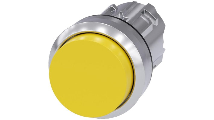 Pulsante tipo Instabile Siemens, serie SIRIUS ACT, diametro montaggio 22 mm, corpo giallo lucido, attuazione momentanea, materiale plastico, anello anteriore in metallo argento, temperatura di esercizio -25°C a 70°C, protezione IP66, IP67, IP69K, certificazioni CE, CSA, EAC, conforme a IEC 60068-2-27, IEC 60068-2-6, IEC 60721, rating NEMA 1, 2, 3, 3R, 4, 4X, 12, 13, registrazione UL.
