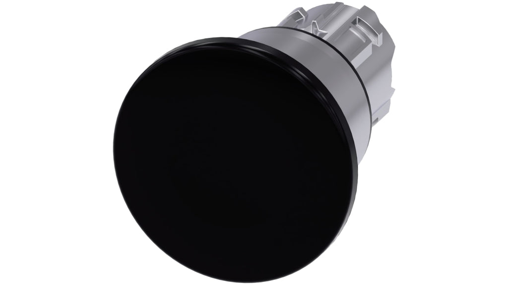 Pulsante a fungo da 22 mm, serie SIRIUS ACT, attuazione a pulsante, tipo ad aggancio, colore nero, design rotondo, diametro pulsante 40 mm, materiale plastica, grado di protezione IP66, IP67, IP69K, montaggio su pannello frontale, collegamento conduttore posteriore.