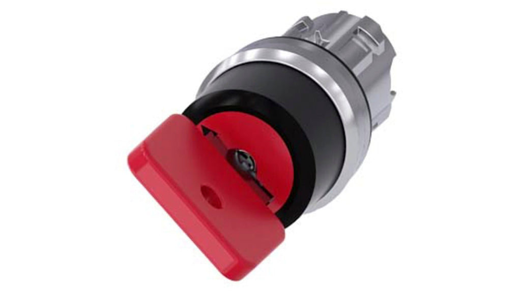 Testa selettore Siemens serie SIRIUS ACT, interruttore a chiave rotondo, diametro foro 22 mm, 2 posizioni di commutazione O-I, serratura n. 73037, 2 chiavi incluse, angolo di azionamento 90 gradi, protezione IP20, IP66, IP67, IP69, IP69K, temperatura operativa da -25 a +70 gradi, durata meccanica 300000 cicli. Colore rosso, materiale metallico lucido.
