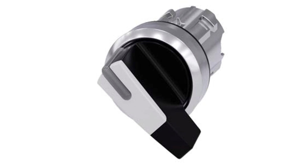 Selettore luminoso Siemens SIRIUS ACT, 22 mm, rotondo, in metallo lucido bianco, impugnatura lunga, 2 posizioni di commutazione O-I, blocco, contatto momentaneo, angolo di azionamento 90 gradi, protezione IP66, IP67, IP69K, attivazione stabile, colore attuatore nero. Codice costruttore 3SU1052-2CF60-0AA0.