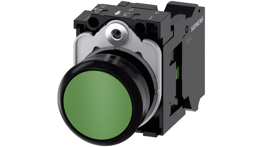 Unità completa pulsante Siemens, SPST, IP66, IP67, IP69(IP69K), diametro forature pannello 22mm, colore pulsante verde, tipo di pulsante rotondo, materiale pulsante plastica, serie SIRIUS ACT, codice produttore 3SU1100-0AB40-3BA0, range di temperatura operativa -25 a +70 gradi Celsius, tensione massima c.c. 500V, massima tensione c.a. 500V, materiale corpo plastica.