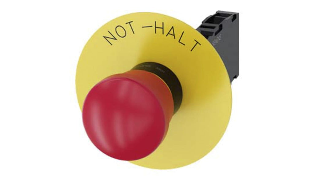 Pulsante di arresto di emergenza a fungo, montaggio a pannello, diametro 22 mm, rotondo rosso in plastica, con blocco positivo e meccanismo di sblocco a trazione, piastra di supporto gialla, iscrizione EMERGENCY STOP, configurazione contatto 1 NA + 1 NC, morsetto a vite, tensione nominale 5-500 V ac e cc, corrente fornita 10 A, profondità 117 mm, larghezza 75 mm, serie SIRIUS ACT.