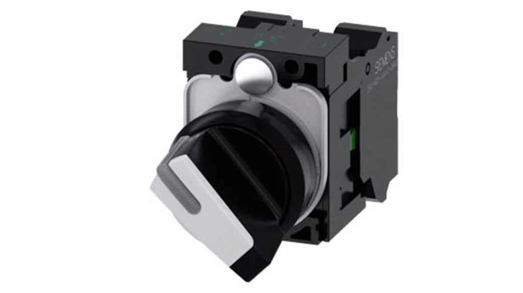 Selettore luminoso a 2 posizioni, diametro foro 22 mm, rotondo bianco in plastica, attuatore corto con impugnatura nera, configurazione contatto SPDT, angolo di corsa 90 gradi, corrente massima 10 A, serie SIRIUS ACT, con supporto, 1 contatto normalmente aperto, 1 contatto normalmente chiuso, terminale a molla, attivazione stabile.