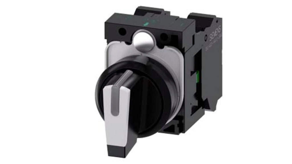 Selettore a 3 posizioni Siemens, diametro foro 22mm, attuatore con impugnatura nera corta, configurazione contatto SPDT, angolo di corsa 45 gradi. Tensione nominale 5-500V, corrente massima 10A, temperatura di esercizio -25 a 70 gradi. Corpo in plastica, collegamenti terminal a molla. Grado di protezione IP20, IP66, IP67, IP69K. Certificazioni CE, CCC, CSA, conforme a DIN EN 61373, IEC 60068-2-27, IEC 60068-2-6.
