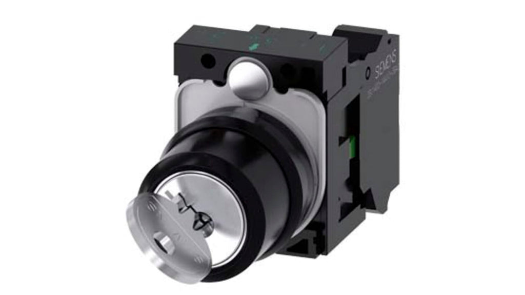 Interruttore a chiave a 2 posizioni, SPST, marchio Siemens. Tipo rotondo in plastica, diametro 22 mm, serratura n. SB30, 2 chiavi, operazioni a ritenuta, angolo di rotazione 90 gradi, contatto 1 NA, morsetto a vite. Range di temperatura operativa -25 a +70 gradi Celsius, tensione nominale 500V c.a. e 500V c.c., durata meccanica 1000000 cicli. Serrature speciali disponibili: SB31, 421, 455.