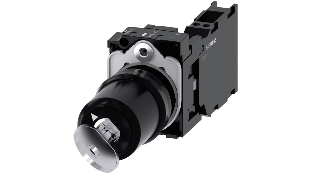 Interruttore a chiave a 2 posizioni, SPST, con protezione IP66, IP67, IP69, angolo di rotazione 90 gradi, temperatura operativa da -25 a +70 gradi Celsius, tensione nominale 500V sia in corrente alternata che continua, durata meccanica 1000000 operazioni, realizzato in plastica, con supporto e terminal a molla, numero di blocco SSG10, 1 NA e 1 NC. Prodotto da Siemens, serie Sirius ACT.