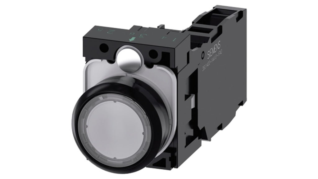 Pulsante illuminato a pannello SPDT, diametro foratura 22 mm, montaggio a pannello, corpo in plastica, configurazione contatto 1-NO/1-NC, collegamento a vite, temperatura operativa -25°C/+70°C, tensione 24VAC/VDC, grado di protezione IP20, IP66, IP67, IP69, IP69K, conforme a EC/EN 60947-1, IEC/EN 60947-5-1, IEC/EN 60947-5-5, serie SIRIUS ACT, colore trasparente, diametro pulsante 29.45 mm.