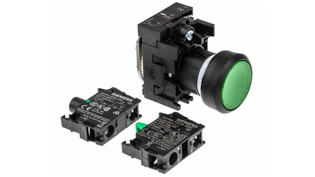 Pulsante illuminato a montaggio a pannello, unipolare normalmente aperto, diametro foratura 22 mm, corpo rotondo in plastica, colore verde, contatto SPST, collegamento a vite, temperatura operativa -25°C a +70°C, tensione massima 500 V CA/V CC, grado di protezione IP20, IP66, IP67, IP69, IP69K, certificazioni EC/EN 60947-1, IEC/EN 60947-5-1, IEC/EN 60947-5-5. Codice produttore 3SU1106-0AB40-1BA0.