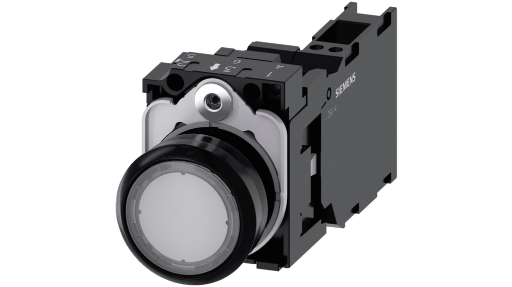 Pulsante luminoso rotondo, 22 mm, SPST, con supporto, 1 NA+1 NC, LED integrato 230 V AC, plastica trasparente, grado di protezione IP66, IP67, IP69K, temperatura operativa da -25 a +70 gradi Celsius, tensione massima 500 V, installazione semplice con concetto snap-on, compatibile con PROFINET, AS-Interface, io-link. Codice produttore 3SU1106-0AB70-3FA0. Confezione da 20 unità.