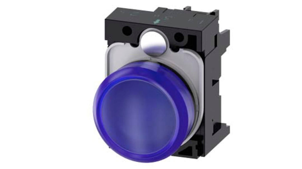 Indicatore LED per montaggio a pannello, diametro foro 22 mm, serie SIRIUS ACT. Tensione nominale 230 V c.a., colore spia blu, lente rotonda liscia in plastica, corpo in plastica, modulo LED integrato, morsetto a vite. Unità completa luce pilota.
