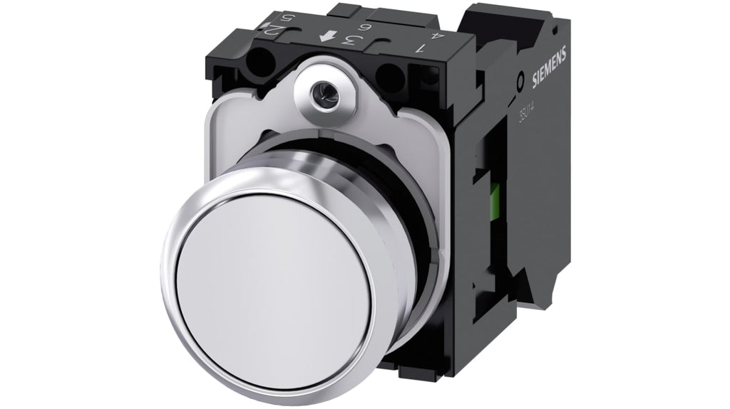 Pulsante rotondo, 22 mm, con contatto SPST, protezione IP66, IP67, IP69K, materiale metallico e plastico, colore bianco lucido, diametro pulsante 29.45 mm, temperatura operativa da -25 a +70 gradi Celsius, tensione massima 500V, configurazione a molla, serie SIRIUS ACT, installazione semplice senza attrezzi, compatibile con PROFINET, AS-Interface e io-link. Codice produttore 3SU1150-0AB60-3BA0.
