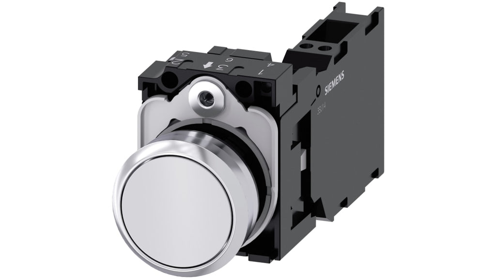 Unità completa pulsante Siemens, SPST, IP66, IP67, IP69(IP69K), diametro forature pannello 22mm, colore pulsante bianco, tipo di pulsante rotondo, materiale pulsante plastica, materiale corpo metallico, tensione massima c.c. 500V, massima temperatura operativa 70°C, minima temperatura operativa -25°C, serie SIRIUS ACT, configurazione contatto SPST, diametro pulsante 29.45mm.