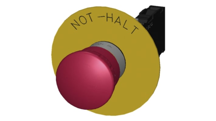 Pulsante di arresto di emergenza Siemens SIRIUS ACT, montaggio a pannello, diametro 22 mm, corpo rosso lucido, attuazione a pulsante, rilascio a rotazione, configurazione contatti SPDT, tensione nominale 5-500 V AC/DC, corrente fornita 10 A, temperatura di esercizio -25°C a 70°C, grado di protezione IP20, IP66, IP67, IP69, certificazioni CCC, CE, CSA, NEMA. Dimensioni 75 mm x 117 mm, materiale plastica.