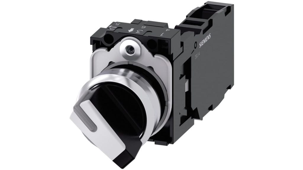 Selettore a 2 posizioni, illuminabile, 22 mm, rotondo, metallo lucido bianco, angolo di azionamento 90 gradi, 1 NA + 1 NC, terminale a vite. Grado di protezione IP66, IP67, IP69K, corrente massima 10 A, tensione massima 500 V c.a. e 500 V c.c. Serie SIRIUS ACT, attivazione stabile. Dispositivo singolo, supporti e moduli da ordinare separatamente.