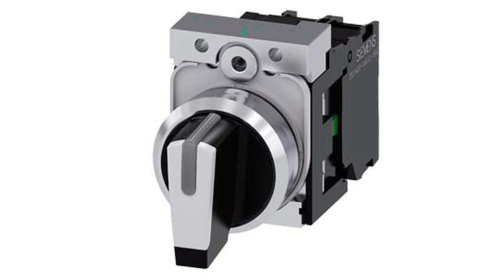 Selettore a 3 posizioni Siemens, diametro foro 22 mm, unità completa in metallo lucido, protezione IP69K, facile installazione senza utensili, configurazione contatto 2 NA, attivazione momentanea, corrente massima 10 A, tensione massima 500 V AC/DC, angolo di corsa 45 gradi, compatibile con PROFINET, AS-Interface, IO-Link, conforme a IEC 60947-1, EN 60947-1, IEC 60947-5-1, EN 60947-5-1.