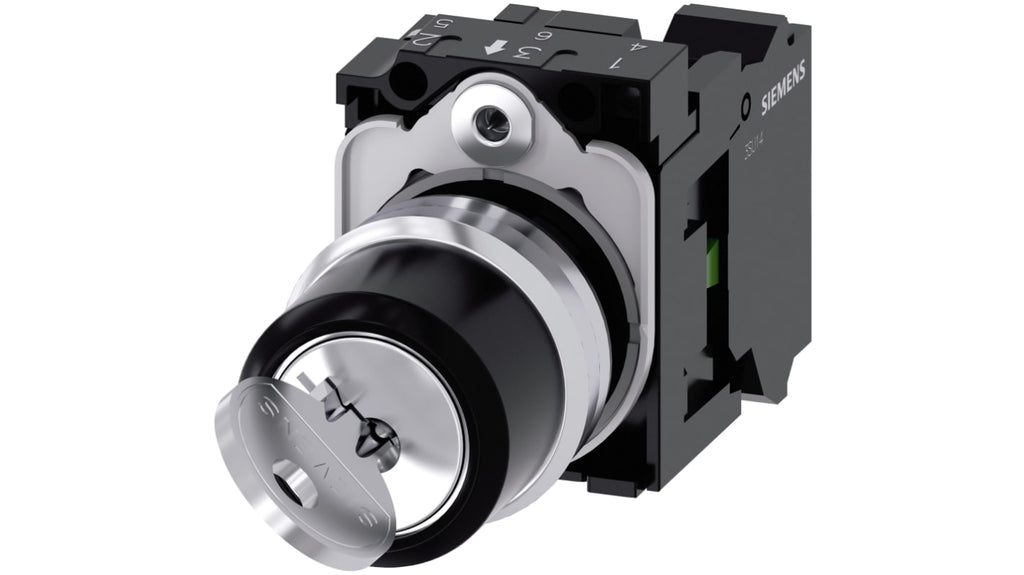 Interruttore a chiave a 2 posizioni, SPST, con protezione IP66, IP67, IP69, angolo di rotazione 90 gradi, temperatura operativa da -25 a +70 gradi Celsius, tensione nominale c.c. e c.a. 500V, durata meccanica 300000 operazioni, realizzato in metallo lucido, con supporto e 2 chiavi. Progettato per ambienti industriali e esterni, compatibile con cablaggio standard e protocolli PROFINET, AS-Interface, io-link. Codice costruttore 3SU1150-4BF11-3BA0.