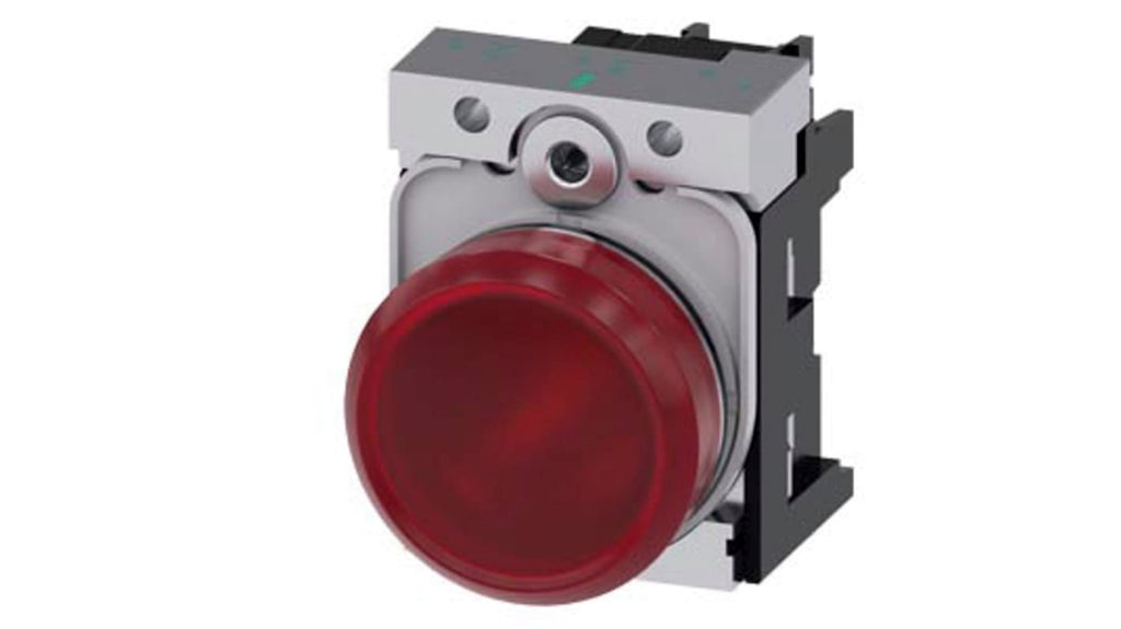 Indicatore LED montato a pannello, diametro foro 22 mm, serie SIRIUS ACT. Lente rotonda rossa liscia lucida in metallo, corpo in plastica, tensione nominale 110 V c.a., modulo LED integrato, morsetto a vite. Unità completa luce pilota.