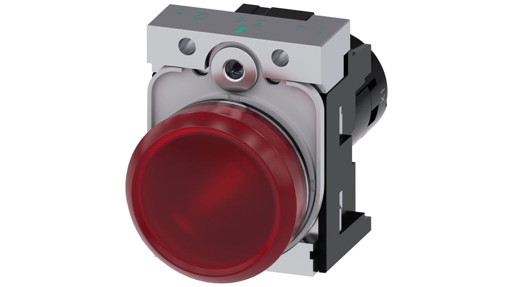 Indicatore LED montaggio a pannello, diametro foro 22 mm, tensione nominale 110 V CA, colore rosso, forma rotonda, materiale corpo metallico, materiale lente plastica, serie SIRIUS ACT, unità compatta con illuminazione integrata, terminal a vite, confezione da 50 unità. Adatto per ambienti industriali, protezione anti-torsione integrata, installazione semplice senza attrezzi.