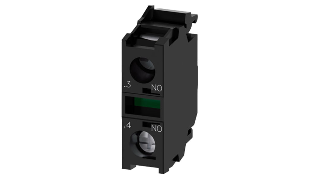 Modulo di contatto per montaggio su piastra frontale, blocco contatti SPDT, tensione nominale 500 V ca/cc, corrente nominale 10 A, configurazione contatto 1CO, terminale a vite, contatti placcati oro, serie SIRIUS ACT. Codice costruttore 3SU1400-1AA10-1LA0, marchio Siemens.