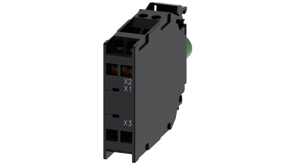 Modulo LED per semafori, tensione nominale 24 V c.c., corrente massima 40 mA, resistenza alla tensione di picco 4 kV, temperatura d'esercizio da -25 a +70 gradi Celsius, classe di protezione IP40 e IP20, sorgente luminosa LED multicolore, compatibile con c.a. e c.c., tipo di connessione a molla. Codice costruttore 3SU1401-1BB24-3AA0, marchio Siemens.