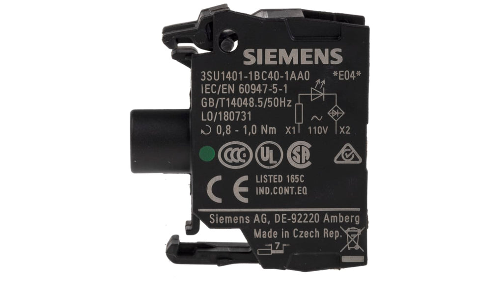 Modulo LED Siemens, alimentazione 110 V c.a., terminali a vite, blocco luminoso della serie SIRIUS ACT. Corrente nominale 20 mA, grado di protezione IP20 e IP40. Compatibile con sistemi avanzati e convenzionali. Certificazioni: CCC, CE, CSA, DIN EN 61373, EAC, IEC 60068-2-27, IEC 60068-2-6, registrazione UL. Disponibile in diverse varianti di colore. Montaggio su piastra anteriore.