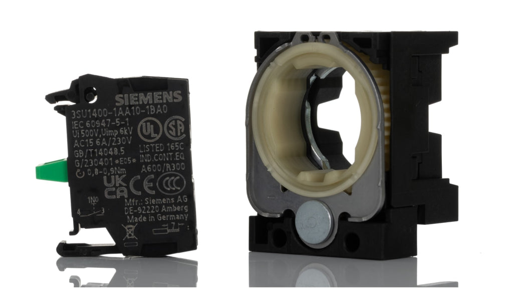 Blocco contatti Siemens, tensione nominale 5 a 500V ca/cc, corrente nominale 6A, configurazione contatto 1 N/A, tipo terminale a vite, montaggio su piastra frontale, serie SIRIUS ACT, grado di protezione IP20, resistenza alle sovratensioni fino a 6 kV, temperatura operativa da -25 a +70 gradi Celsius, affidabilità di un guasto ogni 100 milioni di operazioni. Codice costruttore 3SU1500-1AA10-1BA0.