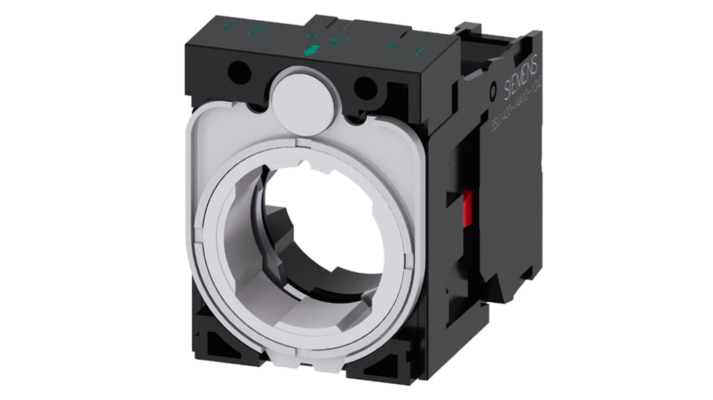 Blocco contatti con supporto Siemens, 1NC, tensione nominale 5 a 500 V c.a./c.c., corrente nominale 6 A, terminali a vite, collare di fissaggio incluso, moduli di contatto impilabili, design antirotazione, adatto per ambienti estremi, senza utensili necessari per il montaggio. Marchio Siemens, codice costruttore 3SU1500-1AA10-1CA0.