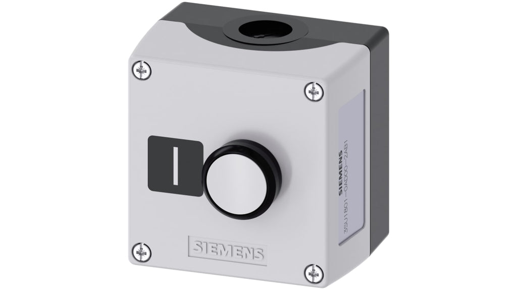 Interruttore di stazione di controllo Siemens, corrente massima 10A, tensione massima 500V, grado di protezione IP66, IP67, IP69, dimensioni 85x85x75 mm, materiale contenitore plastica, attuazione a pulsante con blocco a pressione, diametro foro 22 mm, temperatura operativa da -25 a +70 gradi Celsius, configurazione contatto 1 NA, morsetti a vite per installazione. Codice costruttore 3SU1801-0AD00-2AB1.
