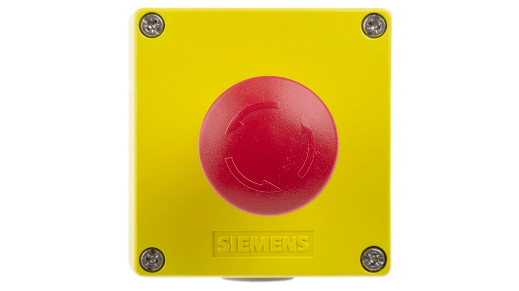 Pulsante di arresto di emergenza Siemens, montaggio a pannello, diametro 22 mm, configurazione contatti 2NC, attuazione a pulsante, rilascio a rotazione, corpo rosso in plastica, contenitore metallico giallo, temperatura di esercizio -25°C a 70°C, grado di protezione IP66, IP67, IP69, certificazioni CCC, CE, CSA, DIN EN 61373, IEC 60068-2-27, IEC 60068-2-6, NEMA 1, 2, 3, 3R, 4, 4X, 12, 13, registrazione UL, VDE. Dimensioni: 109 mm x 85 mm x 89.4 mm, corrente 10 A, tensione 5 a 500 V AC/DC.