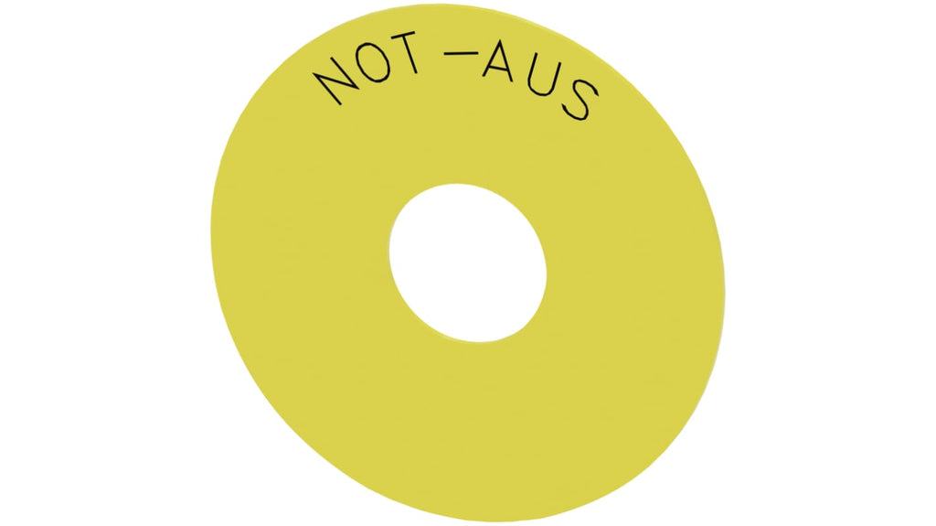 Piastra di supporto per pulsante a fungo ARRESTO DI EMERGENZA, gialla, autoadesiva, diametro esterno 75 mm, diametro interno 23 mm, con scritta "Non-AUS". Prodotto della serie SIRIUS ACT di Siemens, progettato per ambienti industriali, resistente a polvere, oli e soluzioni caustiche. Installazione semplice con sistema snap-on, compatibile con cablaggio standard e sistemi di comunicazione avanzati.