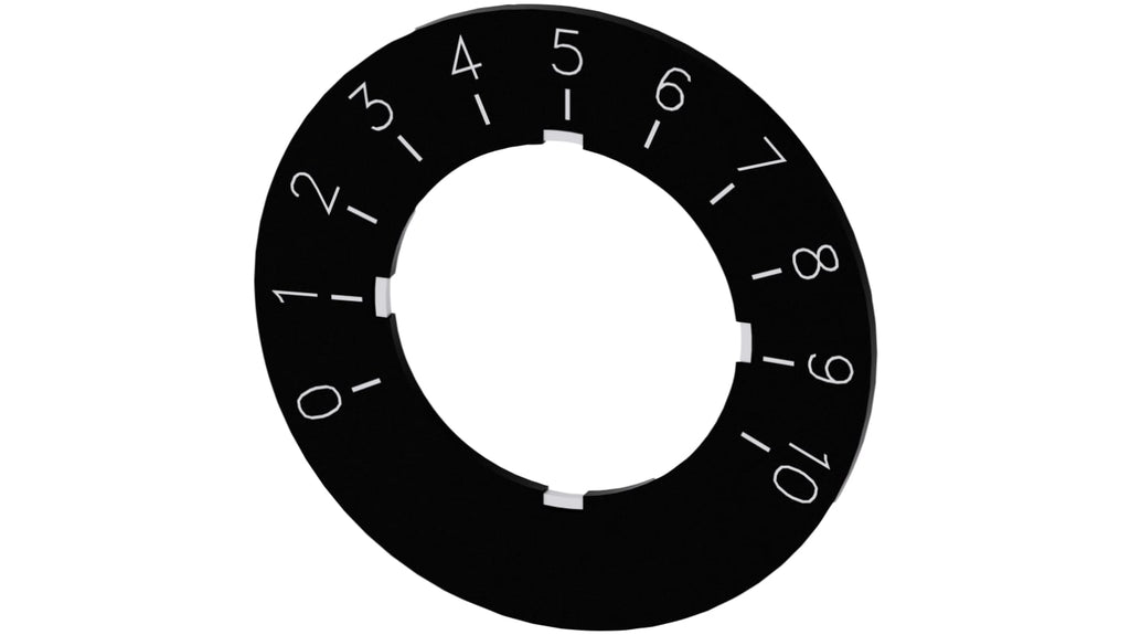 Targhetta di etichettatura per potenziometro, etichetta nera con font bianco, scritta 0...10, diametro esterno 40 mm, progettata per l'uso in ambienti industriali, compatibile con il sistema Sirius ACT di Siemens. Installazione semplice con concetto snap-on, fori di montaggio privi di scanalature, grado di protezione elevato, resistente a polvere, oli e soluzioni caustiche. Accessorio della serie SIRIUS ACT.