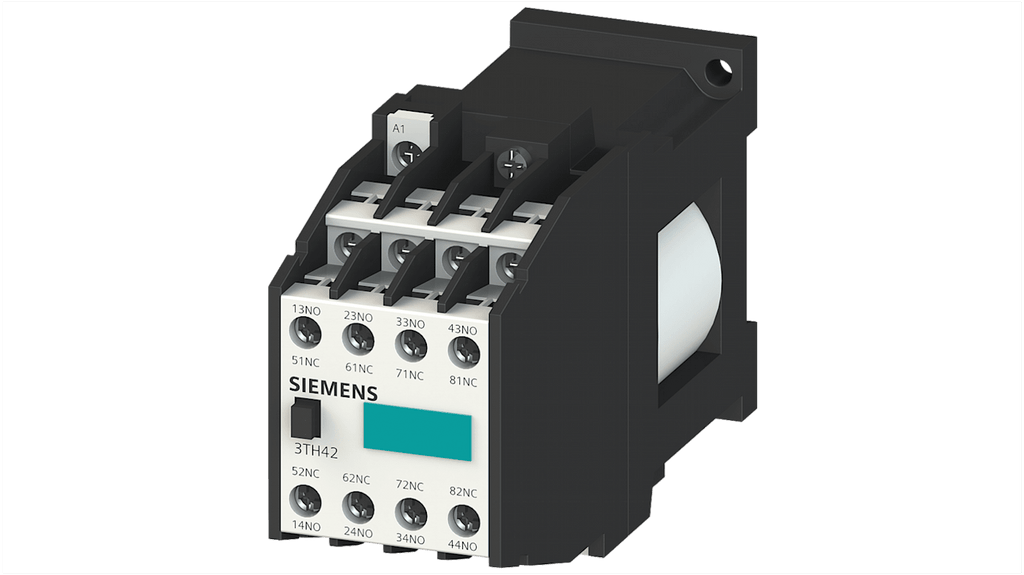 Contattore reversibile per la commutazione dei segnali di controllo, 8 poli, 4NC + 4NO, corrente nominale 6 A, tensione bobina 60 V c.c., designazione terminali conforme agli standard, collegamento elettrico a vite, funzionamento ad azionamento positivo, classe di protezione IP20, temperatura ambiente da -25 a +55 gradi, approvato IEC e UL/CSA. Codice costruttore 3TH4244-0BE4, marchio Siemens.