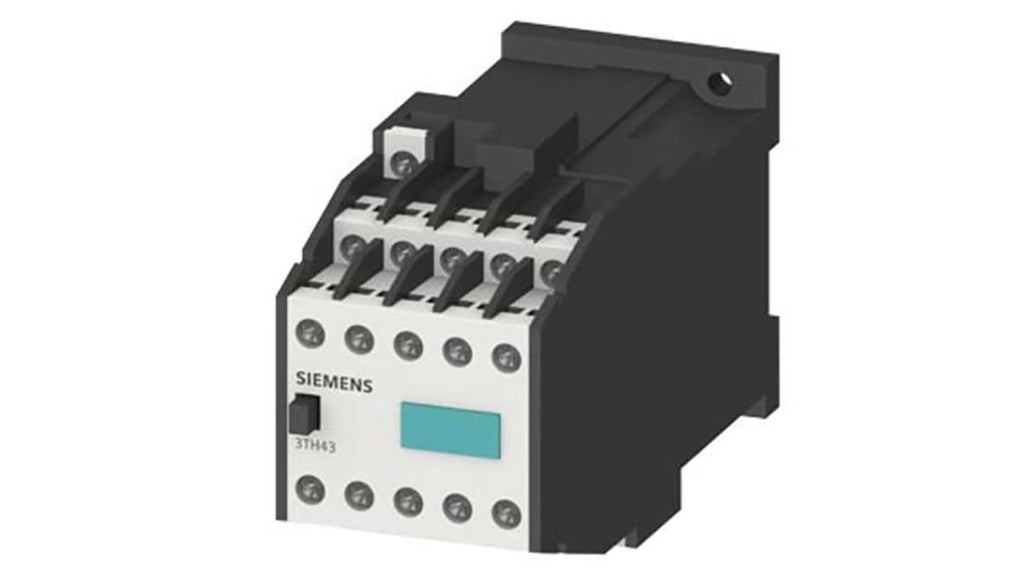 Relè contattore Siemens, 5NO + 5NC, 10 A, codice 3TH4355-0BB4. Corrente nominale contatto 10 A, tensione di controllo 24 V c.c., classe di protezione IP20, circuito ausiliario con terminali a vite, design con protezione contro cortocircuiti, dimensione contattore 0.