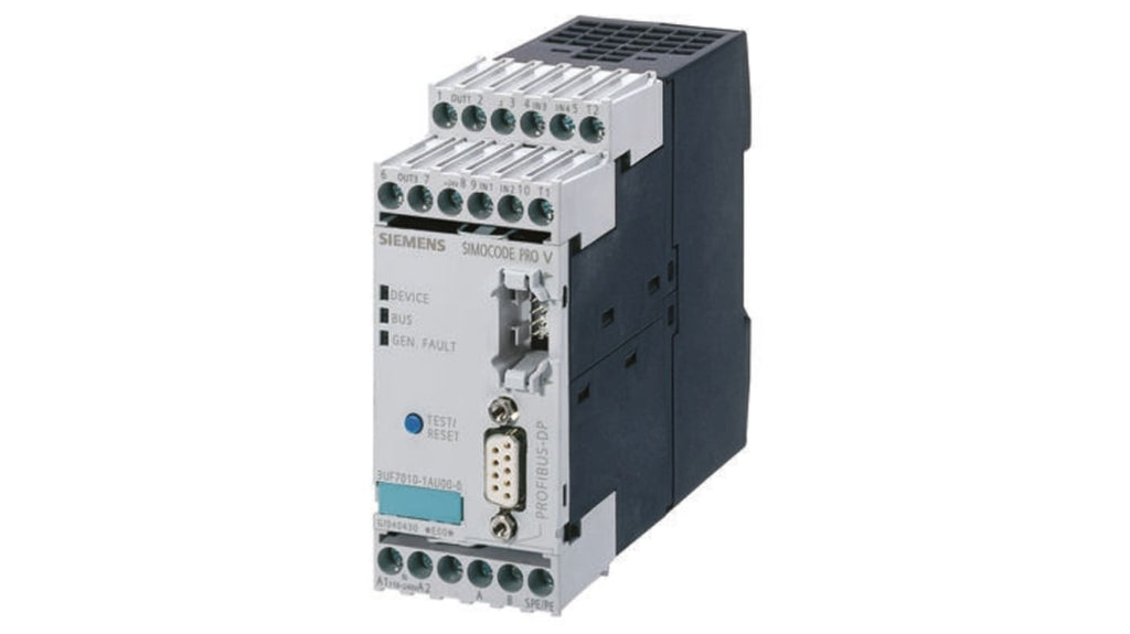 Unità base del motore Siemens, protezione SIMOCODE Pro C, sistema di protezione motore, 4 ingressi, 3 uscite, tensione di alimentazione 24 V c.c., funzionamento autarchico, comunicazione PROFIBUS DP, monitoraggio corrente e ore di esercizio, dimensioni 111mm x 45mm x 95mm, temperatura operativa da -25°C a +60°C, compatibile con moduli di rilevazione corrente e controllo. Codice costruttore 3UF7000-1AB00-0.