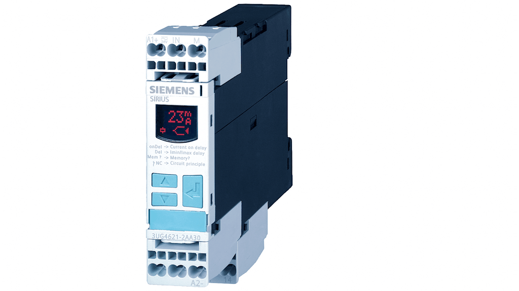 Relè di monitoraggio corrente Siemens serie 3UG, funzione di monitoraggio di fase, contatti SPDT, isolamento galvanico tra ingresso e uscita, reset automatico, grado di protezione IP20, sistema di collegamento terminal a vite. Applicazione di controllo, sensibilità alla tensione, sovratensione.