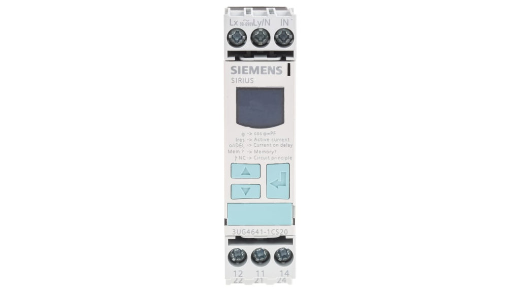 Relè di monitoraggio corrente monofase Siemens, modello 3UG4641-1CS20, DPDT, tensione di alimentazione 24-240 V c.a./c.c., intervallo di misurazione corrente 0.2-10 A, applicabile per frequenze 40-500 Hz, tempo iniziale di deviazione 0.1-20 s, ritardo di spegnimento 0.1-20 s, dimensioni 91 x 22.5 x 102 mm, temperatura operativa -25 a +60 gradi Celsius, montaggio su guida DIN, contatti 1 C/O.