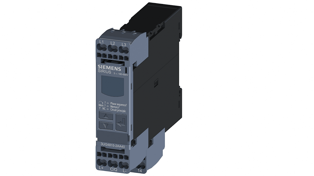 Relè di monitoraggio fase Siemens serie 3UG, SPDT, codice 3UG4815-2AA40, applicazione di controllo fase elettrica, isolamento galvanico ingresso-uscita, reset automatico, classe di protezione IP20, terminale a molla, dimensioni 91 x 22.5 x 103 mm, temperatura operativa da -25 a +60 gradi Celsius, sensibilità a sovratensione, sottotensione, asimmetria di fase, errore di fase, sequenza di fase.