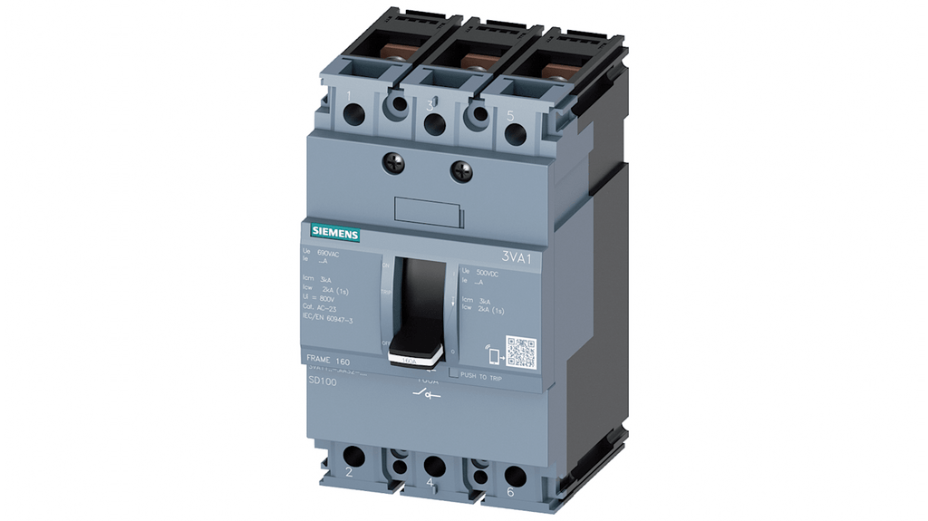 Sezionatore con interruttore, Siemens, modello 3VA1116-1AA32-0AA0, 3 poli, corrente massima 160A, tipo fisso, protezione IP40, potenza nominale 22kW, serie 3LD, approvazione EAC e CE, buona durata meccanica.