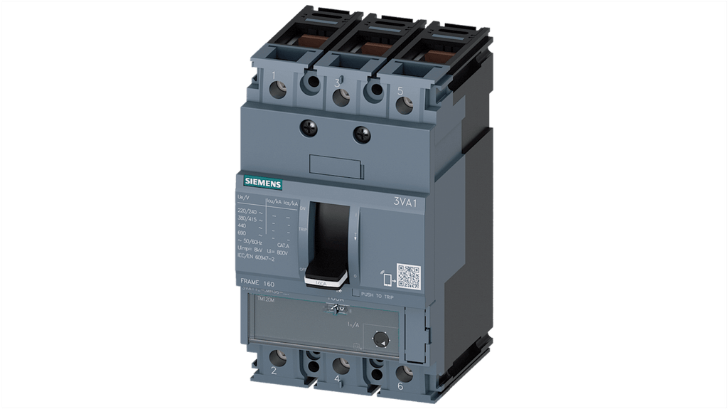 Interruttore magnetotermico Siemens 3P 50A, numero di poli 3, amperaggio 50A, gamma SENTRON, serie 3VA1, tipo di montaggio guida DIN, design compatto, versioni fisse e plug-in, unità di scatto magnetotermiche, applicazioni in corrente alternata e continua, accessori modulari interni, nessuna riduzione della potenza fino a 50 gradi Celsius.