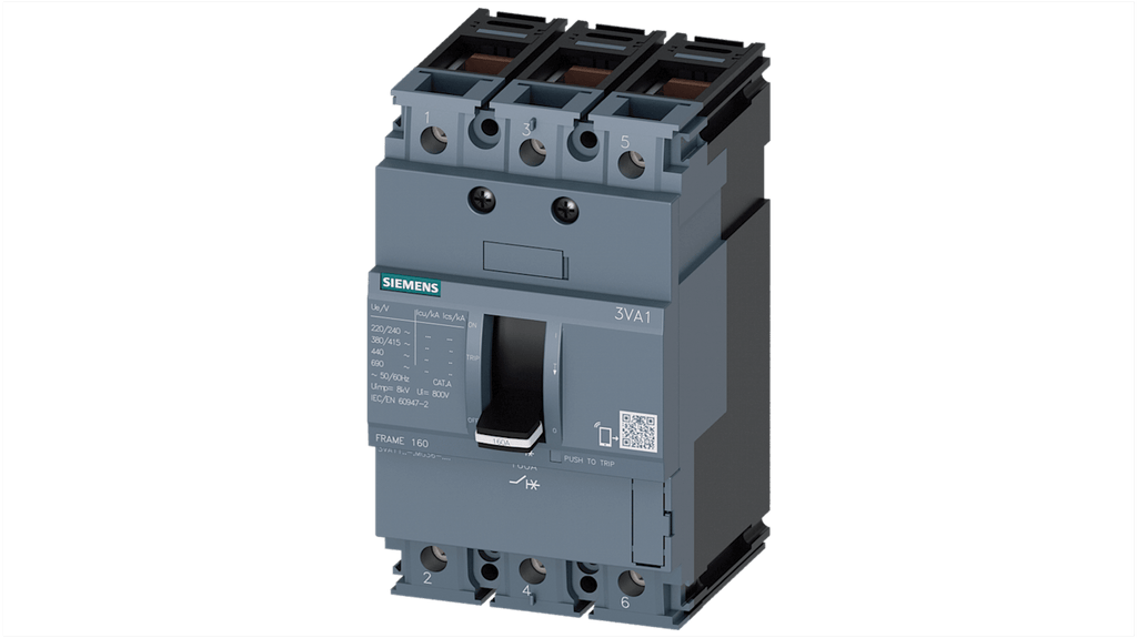Interruttore magnetotermico Siemens 3P 12.5A, numero di poli 3, amperaggio 12.5A, gamma SENTRON, serie 3VA1, tipo di montaggio guida DIN, design compatto, versioni fisse e plug-in, unità di scatto magnetotermiche, applicazioni in corrente alternata e continua, accessori modulari interni, nessuna riduzione della potenza fino a 50 gradi Celsius.