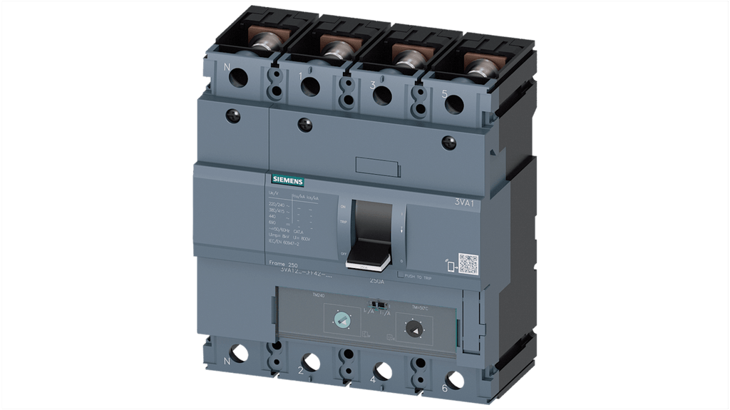 Interruttore magnetotermico Siemens 4P 160A, codice 3VA1216-5GF42-0AA0, design compatto, versione fissa, montaggio guida DIN, unità di scatto magnetotermiche, applicazioni in corrente alternata e continua, nessuna riduzione della potenza fino a 50 gradi Celsius, accessori interni modulari, piattaforma accessori uniforme su tutti gli interruttori automatici 3VA, gamma SENTRON, serie 3VA1.