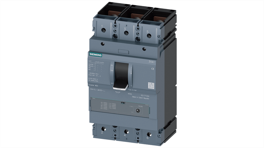 Interruttore magnetotermico Siemens 3P 320A, codice costruttore 3VA1332-6MH32-0AA0, design compatto, versione fissa, montaggio guida DIN, unità di scatto magnetotermiche, applicazioni in corrente alternata e continua, nessuna riduzione della potenza fino a 50 gradi Celsius, accessori interni modulari, piattaforma accessori uniforme su tutti gli interruttori automatici 3VA, gamma SENTRON, serie 3VA1.