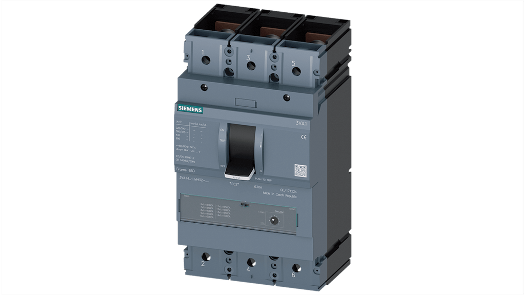 Interruttore magnetotermico Siemens 3P 500A, codice 3VA1450-6MH32-0AA0, design compatto, versione fissa, montaggio guida DIN, unità di scatto magnetotermiche, applicazioni in corrente alternata e continua, nessuna riduzione della potenza fino a 50 gradi Celsius, accessori interni modulari, piattaforma accessori uniforme su tutti gli interruttori automatici 3VA, serie SENTRON.
