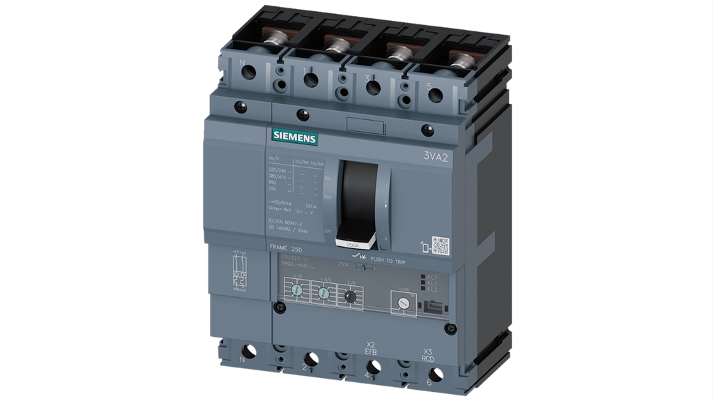 Interruttore magnetotermico Siemens 4P 250A, codice costruttore 3VA2225-5HL42-0AA0, design compatto, montaggio guida DIN, tecnologia plug-in, risposta di protezione selettiva 1:2,5, unità di viaggio elettroniche, comunicazione retrofit per serie ETU 5 e 8, funzione di misurazione integrata a seconda dell'ETU, applicazioni CA, nessuna riduzione della potenza fino a 50 gradi Celsius, accessori modulari e facili da montare.